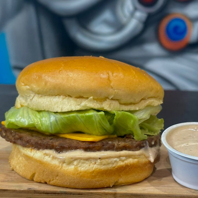 Pão brioche, molho tasty, 2 hambúrgueres 90g cada, fatias de queijo cheddar, tomate, cebola roxa e alface americana!