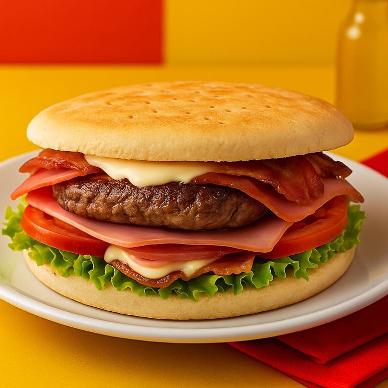 Presunto, hamburguer de costela, muçarela, milho, ervilha, ovos, bacon, pão, alface, tomate, maionesa da casa.