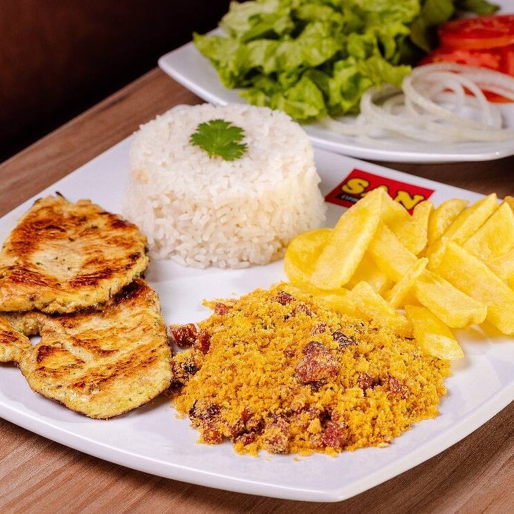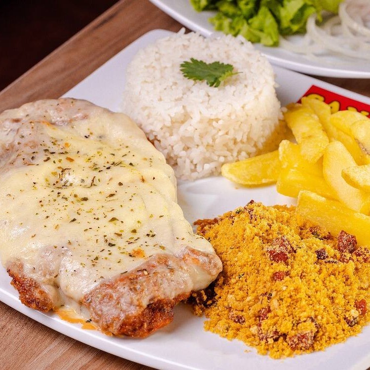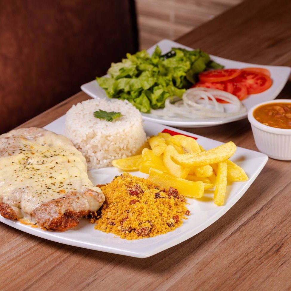Arroz, feijão, farofa, batata frita e filé de frango com muçarela e molho especial.