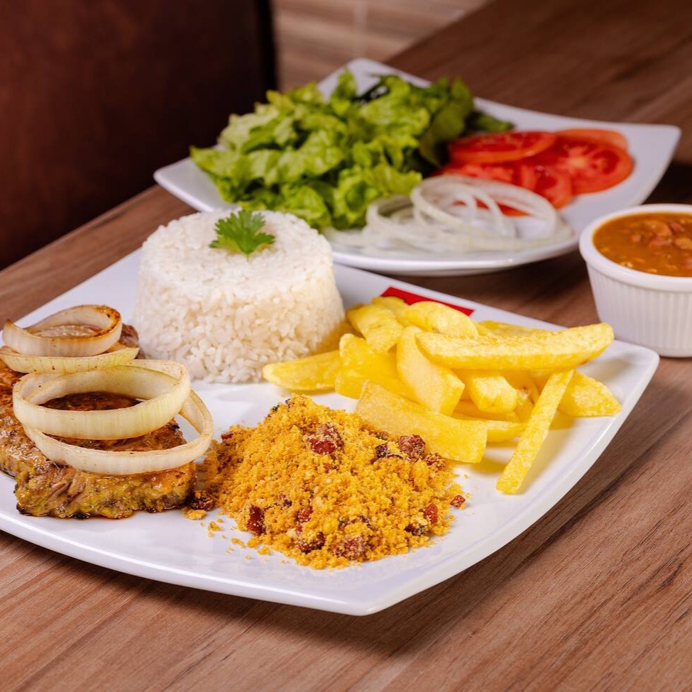 Arroz, feijão, farofa, batata frita e contra filé acebolado.