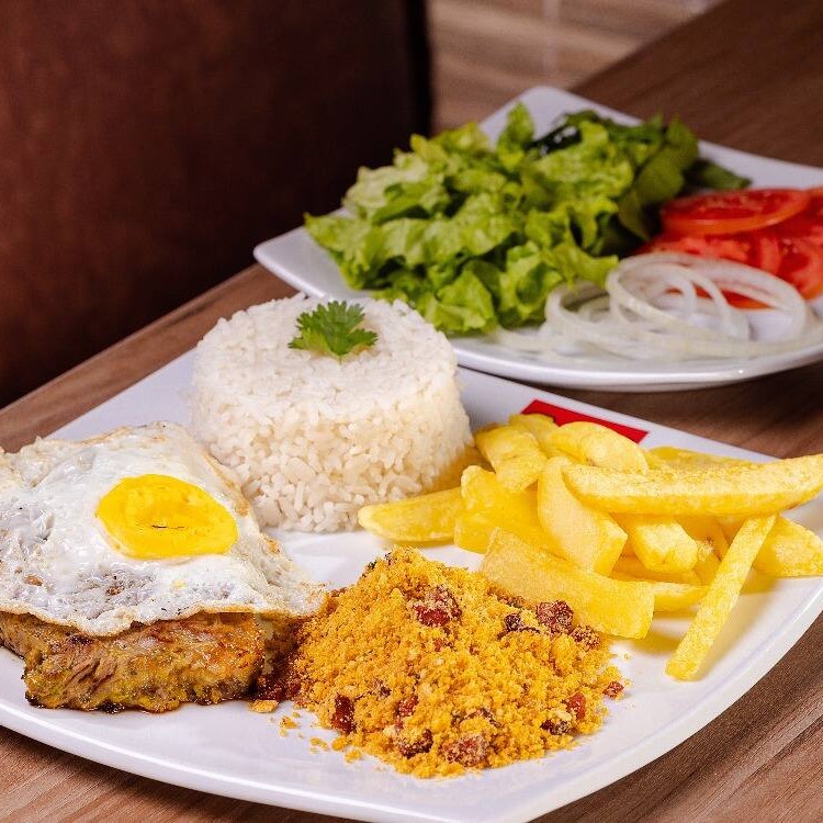 Arroz, feijão, farofa, batata frita, bife e ovo.