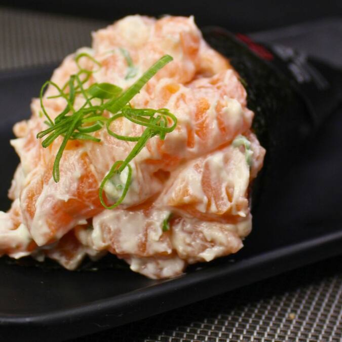 Delicado bolinho de arroz envolto em salmão fresco, recheado com tatar de salmão e finalizado com cream cheese e cebolinha, combinando textura macia e sabor marcante.