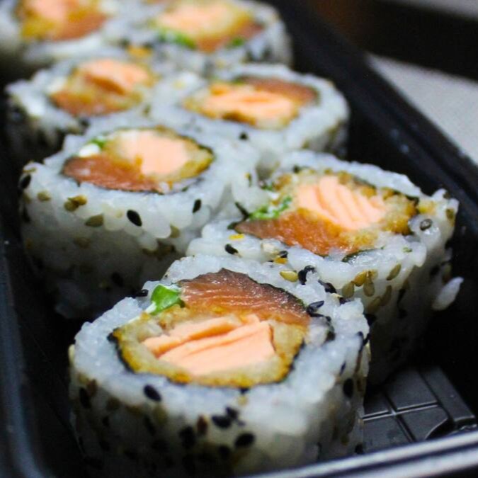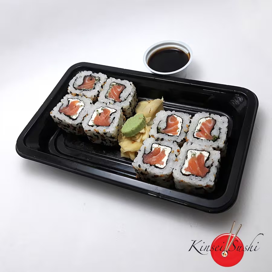 Salmão fresco, cream cheese e cebolinha. Sushi enrolado com alga por fora. 8 unidades.