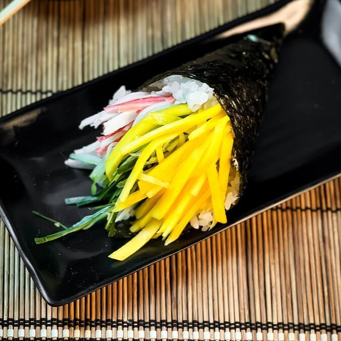 A combinação clássica e refrescante de kani kama, manga e pepino crocante, cuidadosamente envoltos em arroz japonês, gergelim e com alga por dentro. (8 unid.)