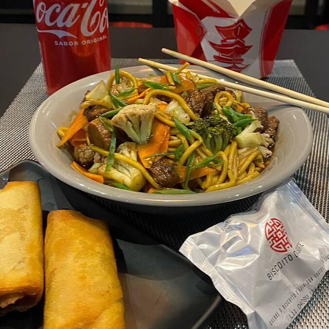 Saborosa combinação de carne e frango, salteados com macarrão e legumes frescos — acelga, brócolis, couve-flor, cebola, pimentão, cenoura e cebolinha.