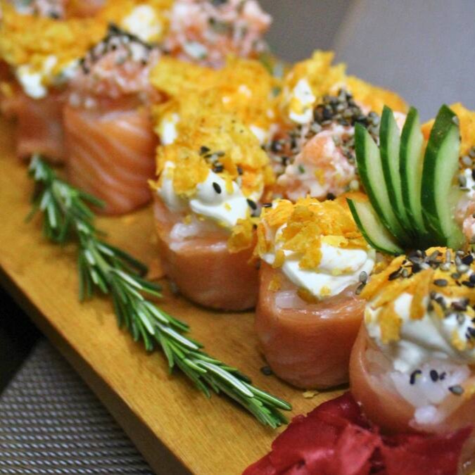 Delicado bolinho de arroz envolto em salmão fresco, recheado com cream cheese e Doritos, combinando cremosidade e crocância irresistível.