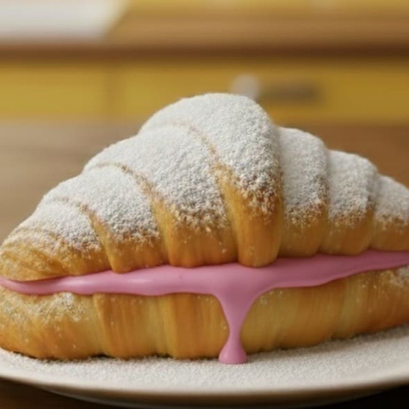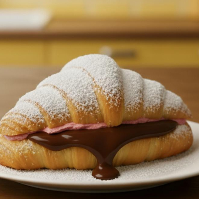 Um croissant tão gostoso que chega a ser pecado: recheado com creme de chocolate ao leite e creme de morango, ele é pura tentação. Uma larica intensa pra quem não resiste a um sabor marcante.