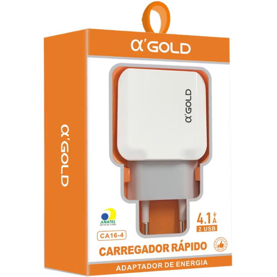 Carregador rápido α’Gold 4.1A com 2 entradas USB, ideal para carregar dois aparelhos ao mesmo tempo com rapidez e segurança