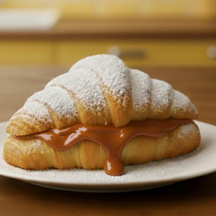 Bateu a vontade de um docinho? Toma esse croissant folhadinho e lotado de doce de leite pra resolver seu problema. Crocante, cremoso e 100% satisfatório. É larica doce de respeito!”