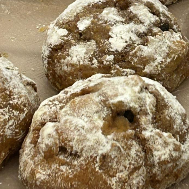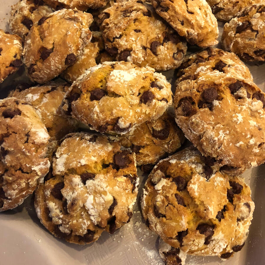 Broa à base de batata e abóbora cabotiá com nozes e canela na massa, recheada com gotas de chocolate