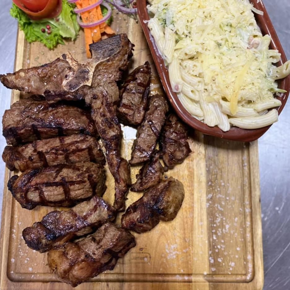 Corte Nobre Do Traseiro (1,3 kg Aprox)Com Osso Divido De Um Lado File Mignon E Do Outro Contra File.Acompanha Uma Massa De Sua Escolha,Nao Inclui Os Molhos De Camarao E Frutos Do Mar