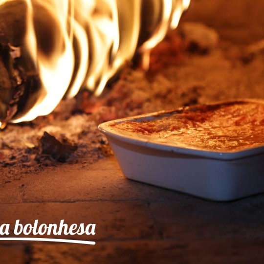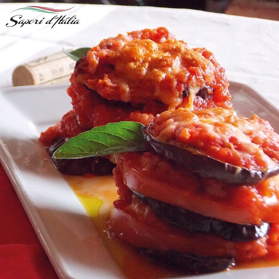 Berinjela, mozzarella, molho de tomate, manjericão e parmesão, gratinado no forno à lenha.