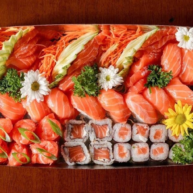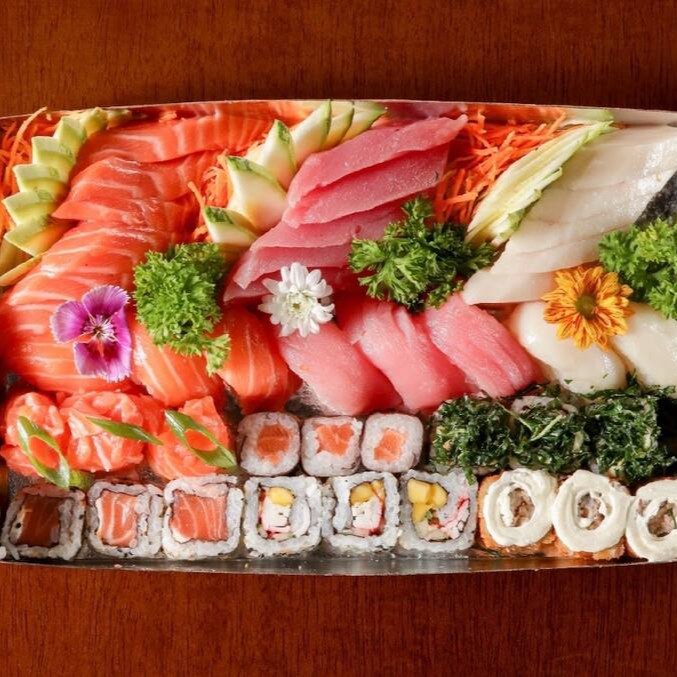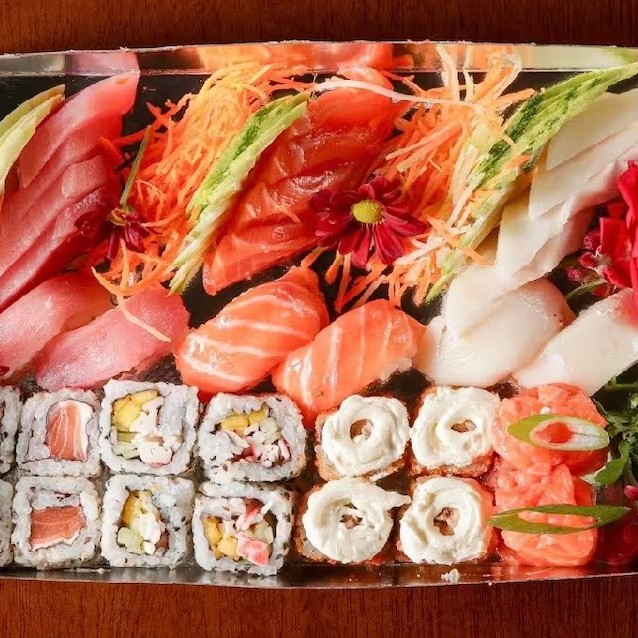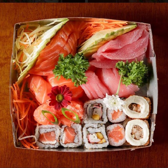 52 unidades - 20 sashimis, 10 sushis, 4 jhous, 4 kappas, 4 uramakis salmão, 4 hot holl, 2 uramakis skin e 4 uramakis califórnia