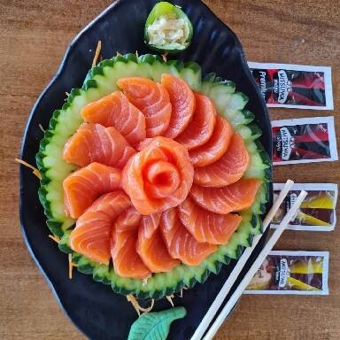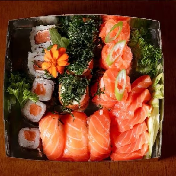 34 unidades - 12 sashimis, 8 sushis, 4 uramakis salmão, 4 salmonmakis e 6 jhous