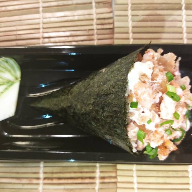 Sushi de salmão picadinho com cebolinha e maionese.