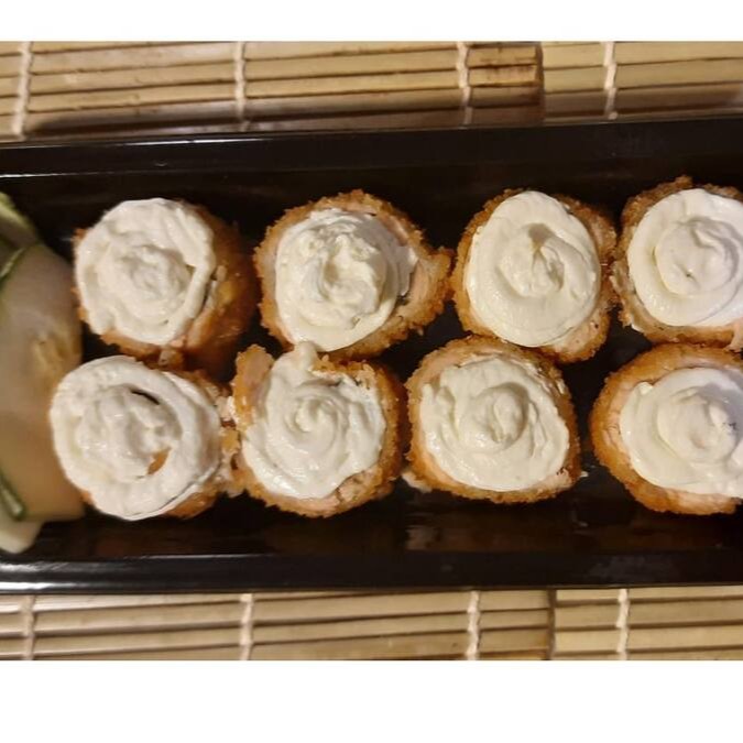 8 Unidades. Makisushi de kani, salmão empanado, arroz e molho tarê.