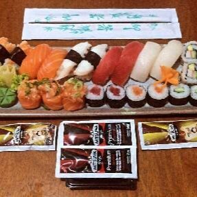 10 sushis, 3 jhous, 2 tekkas, 2 kappas, 2 uramakis califórnia e 2 salmonmakis.