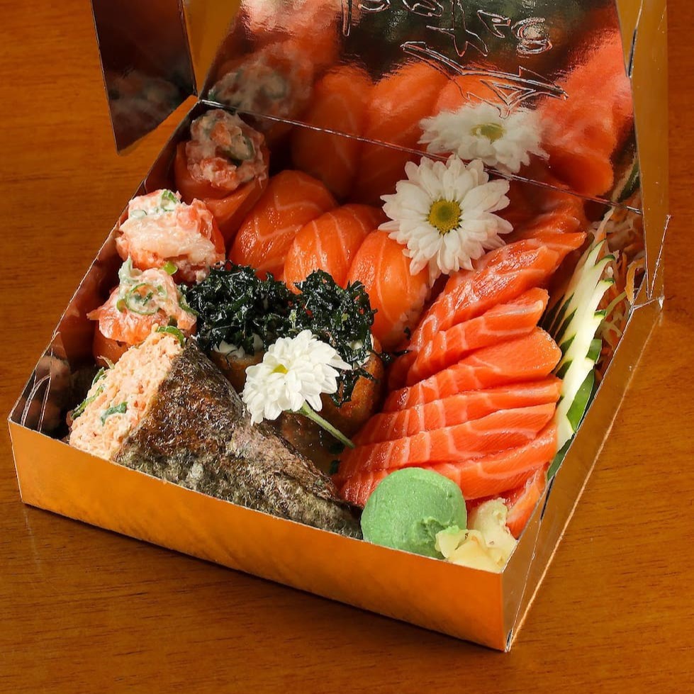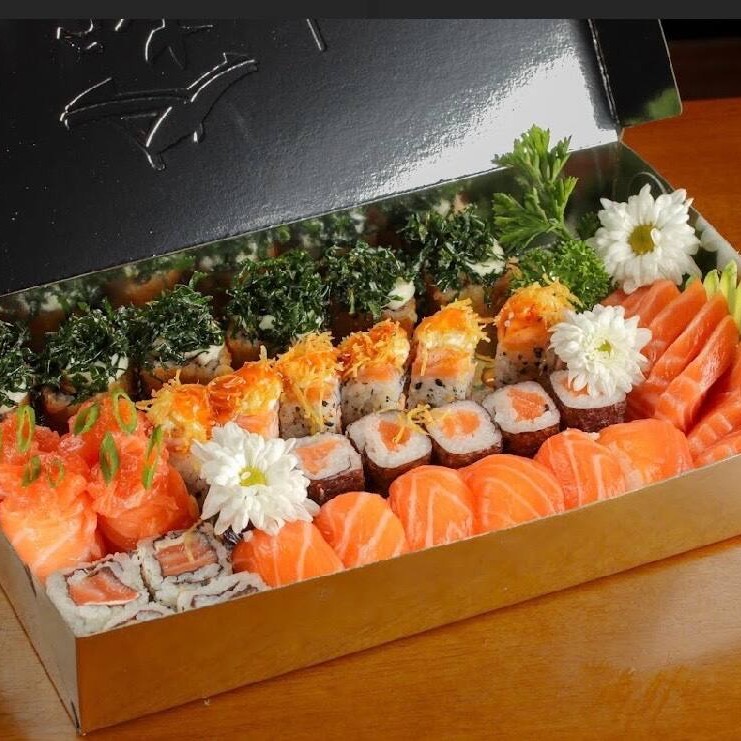 10 sashimis de salmão, 6 niguiri de salmão, 6 salmomaki ,4 uramaki de salmão , 4 Jhou salmão, 4 uramaki Filadélfia, 6 hot fila