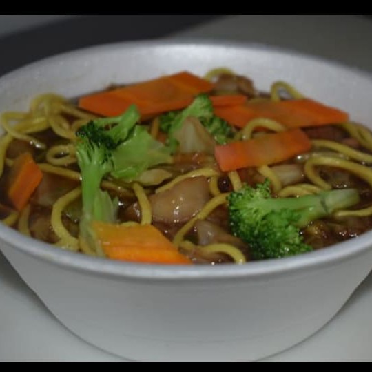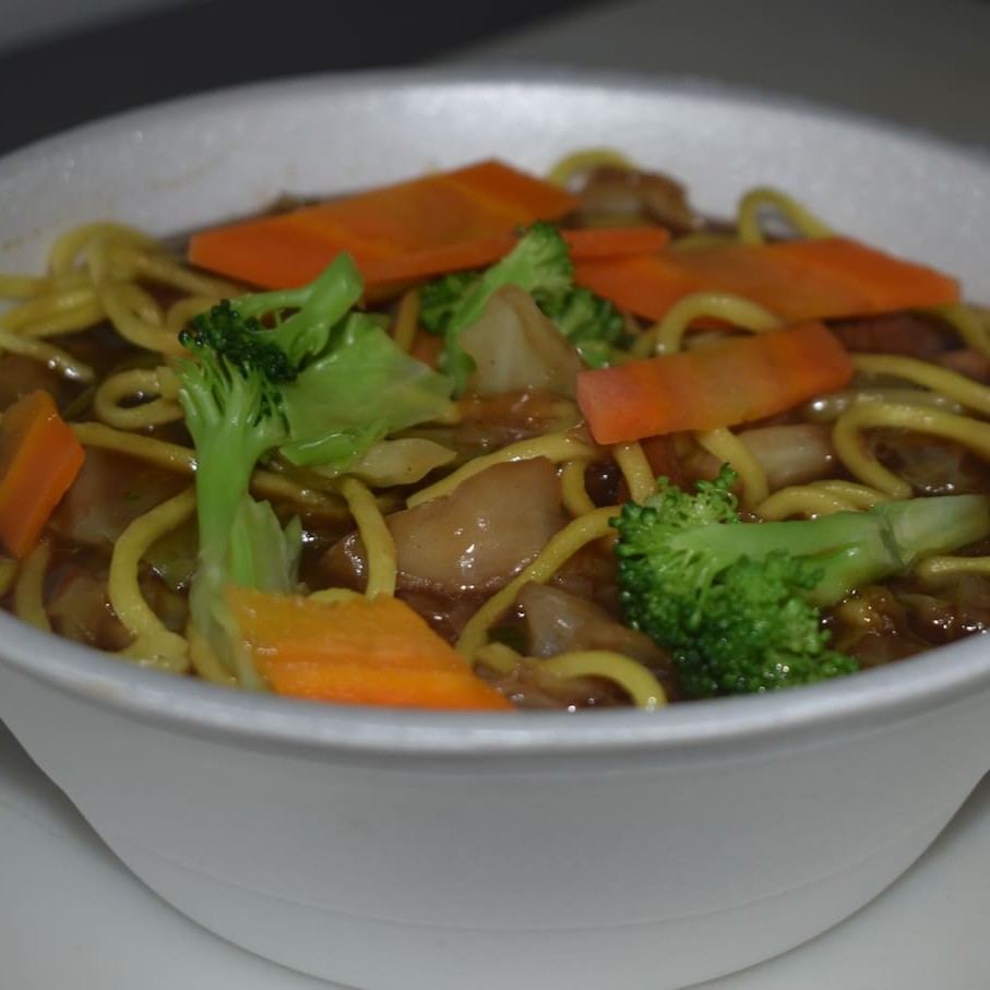 Macarrão, carne bovina, frango e legumes (cenoura, brocolis couve-flor e repolho).