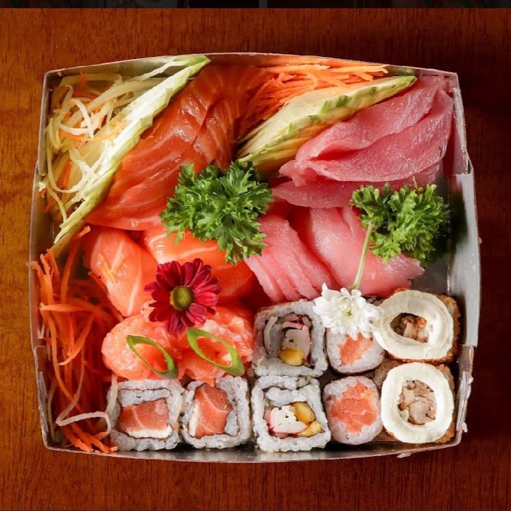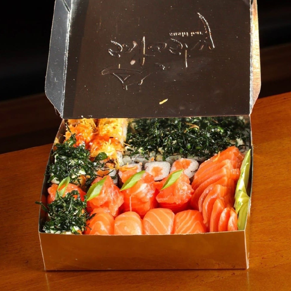 52 unidades - 20 sashimis, 10 sushis, 4 jhous, 4 kappas, 4 uramakis salmão, 4 hot holl, 2 uramakis skin e 4 uramakis califórnia