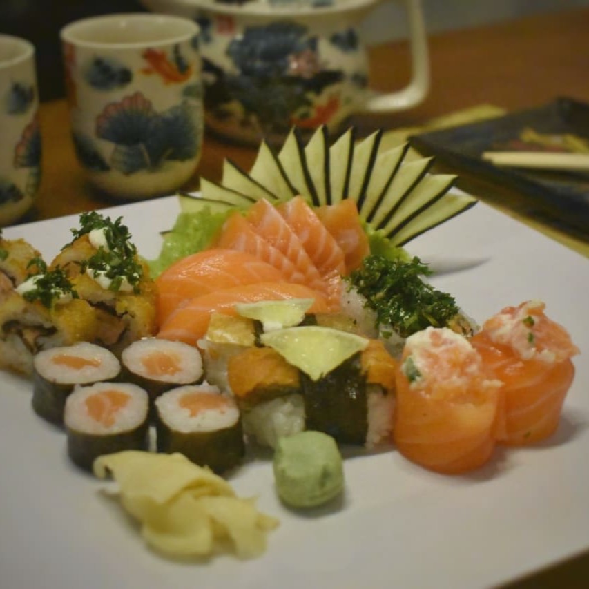 34 unidades - 12 sashimis, 8 sushis, 4 uramakis salmão, 4 salmonmakis e 6 jhous