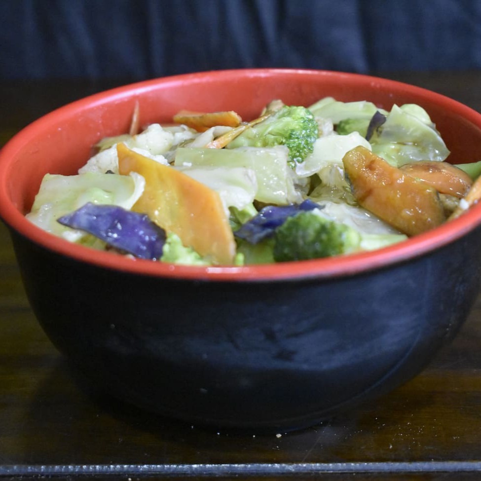 Macarrão, shimeji e legumes (cenoura, brócolis, couve-flor, e repolho).