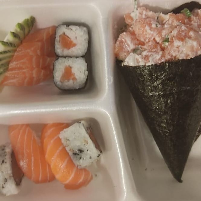 10 sushis, 3 jhous, 2 tekkas, 2 kappas, 2 uramakis califórnia e 2 salmonmakis.