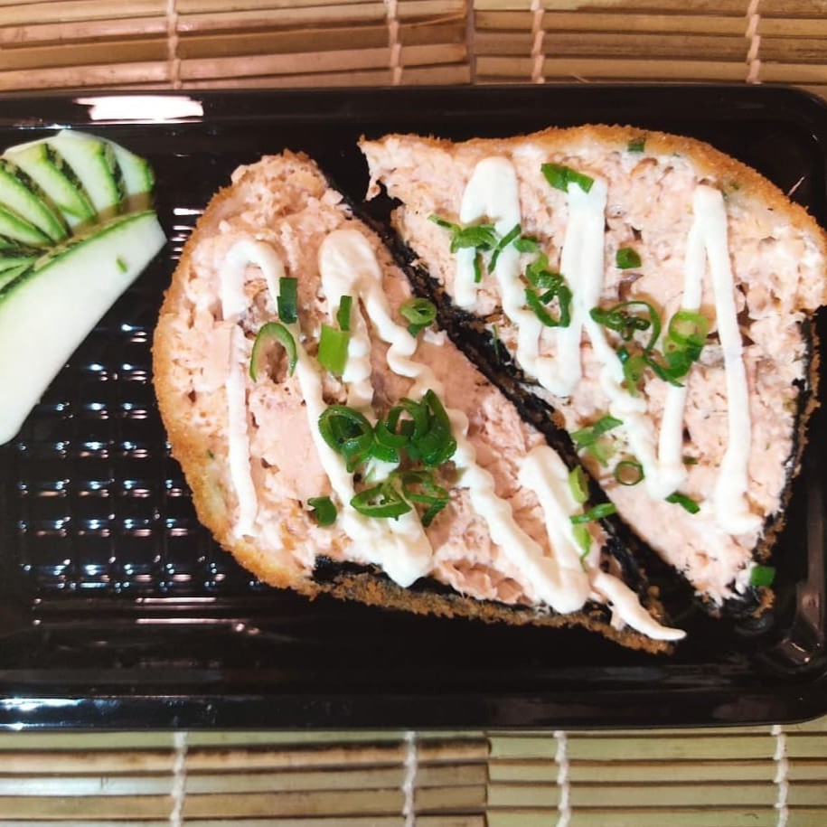 Bolinho de arroz e pepino recheado com salmão picadinho com cebolinha e maionese.