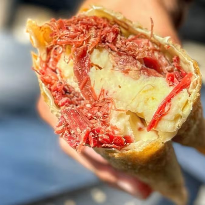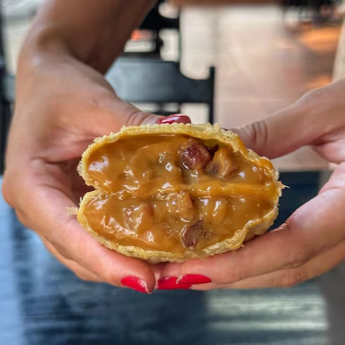 Pastel de doce de leite super cremoso com bacon em cubos fritos