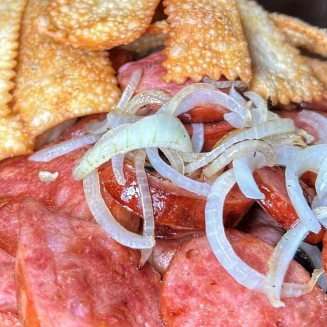 Pastel de pizza (presunto, queijo mussarela, tomate e orégano) com Catupiry Original.