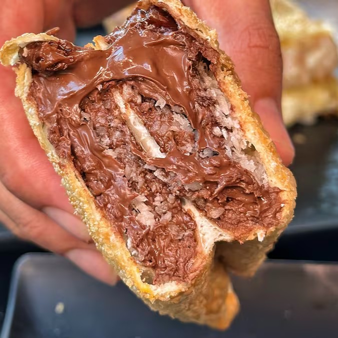 Pastel de pizza (presunto, queijo mussarela, tomate e orégano) com Catupiry Original.