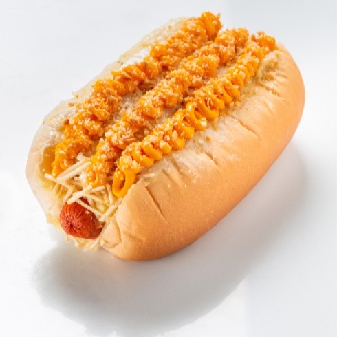 Pão, 2 salsichas, catchup, mostarda, molho de tomate, milho, vinagrete, batata palha, uma generosa camada de purê, queijo ralado, maionese e alho frito+ Chilli (Carne moderadamente apimentada) + Doritos + Catupiry Original.