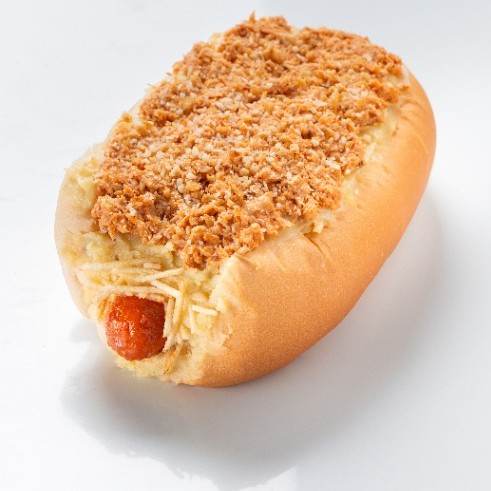 Pão, 1 salsicha vegetariana, catchup, mostarda, molho de tomate, milho, vinagrete, batata palha, uma generosa camada de purê, queijo ralado, maionese e alho frito.