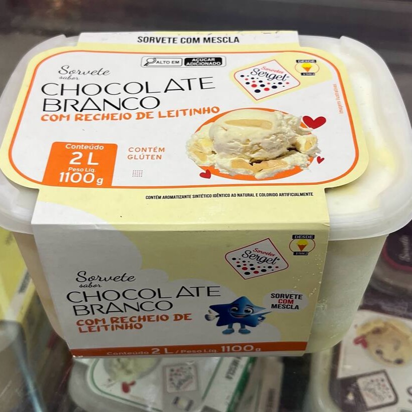 Sorvete sabor chocolate branco, com recheio de Leitinho