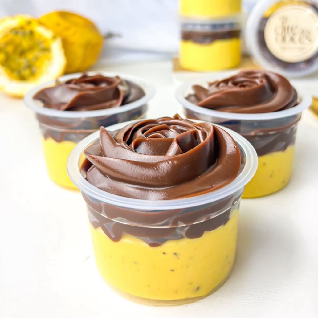 Nosso delicioso mousse de maracujá com um sabor bem acentuado coberto com nosso brigadeiro 50% cacau .
