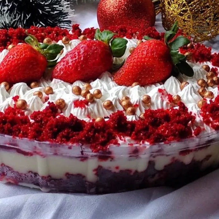 Massa red velvet fofinha, mousse de cream cheese e Ninho com geleia de morango.