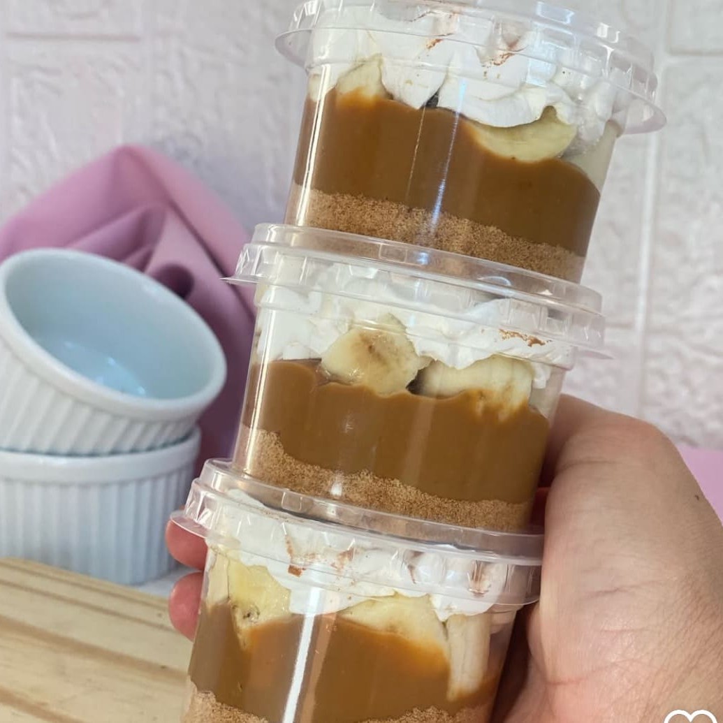 Farofa crocante amanteigada, nosso delicioso doce de leite,banana in natura , coberta com nosso maravilhoso chantininho. doces no pote , banana, doce de leite , canela , sobremesa leite condensado