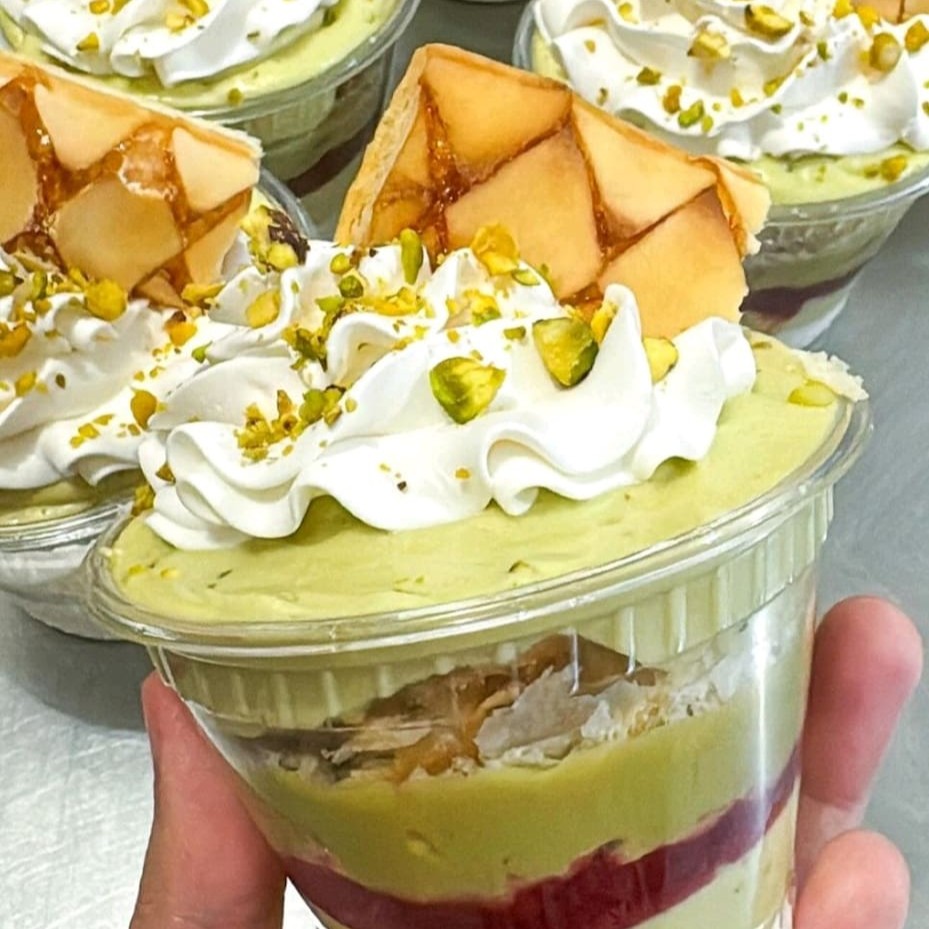 Apresentando a sensação do momento na nossa categoria de 'Novidades': uma tentação criativa e irresistível para os amantes de pistache! Delicie-se com o nosso copo generosamente preenchido com um mousse de Ninho deliciosamente suave e cremoso, acompanhado de nosso autêntico brigadeiro gourmet de pistache. Para adicionar um toque especial, incluímos nossa geléia de morango artesanal, que traz um sabor frutado ao prato. Finalizamos com pistache torrado e triturado, proporcionando um toque crocante que faz deste prato uma experiência sensacional. Prepare-se para uma sobremesa maravilhosa, refrescante e viciante! Tags: sobremesas, pistache, brigadeiro, pudim, copo da felicidade, doces, geleia.