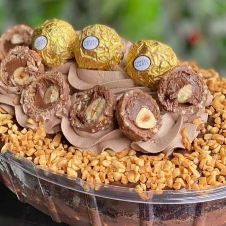 Feito com nosso delicioso Mousse chocolatudo, nosso brownie crocante por fora e macio por dentro, pedaços de Ferrero Rocher e castanhas, nosso maravilhoso brigadeiro ao leite, finalizando com Nutella.