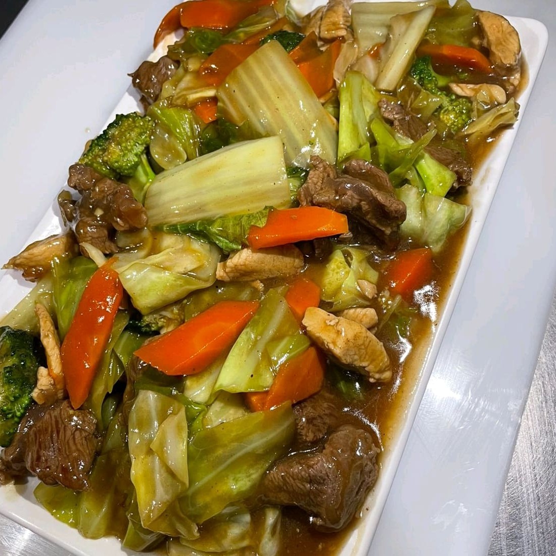 Yakisoba Tradicional Feito com carne, frango, legumes e macarrão.