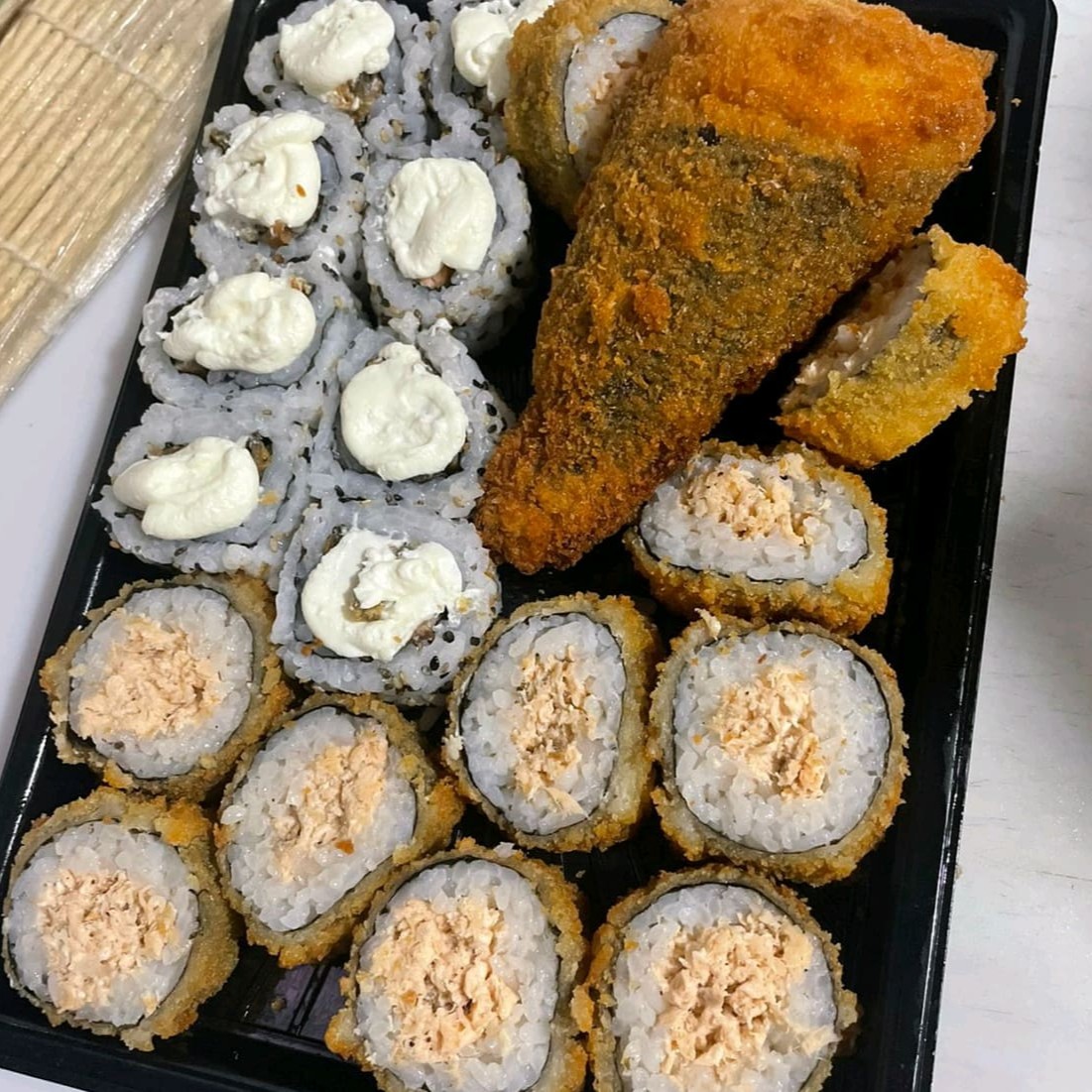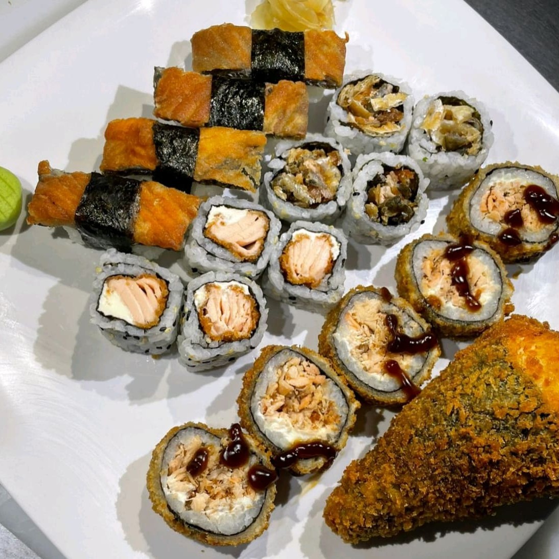 1 temaki de salmão frito, 1 huramaki shin com cream cheese, 1 hot roll inpanado 10 un