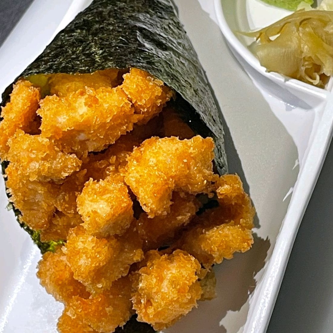 Um delicioso temaki de salmão empanado com tempero do chefe,uma delícia