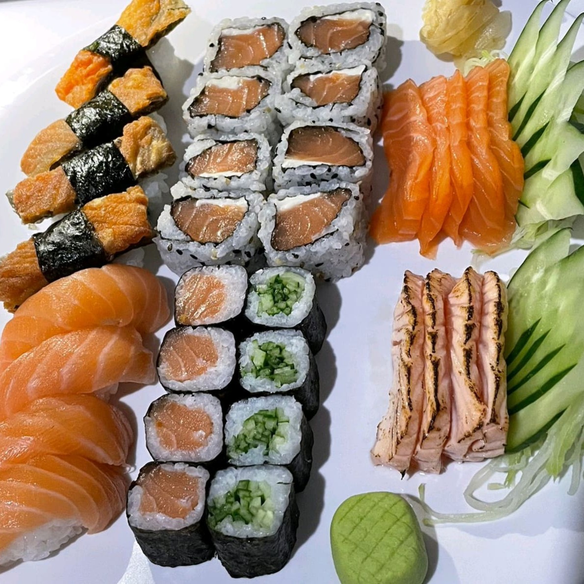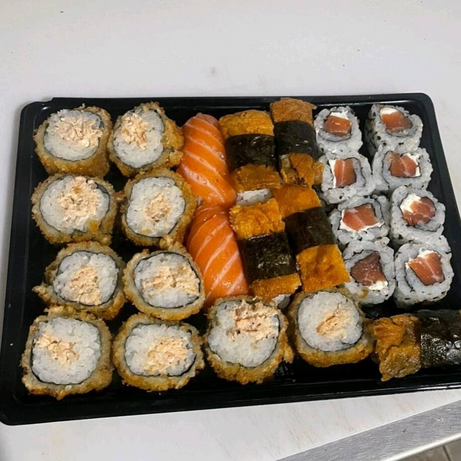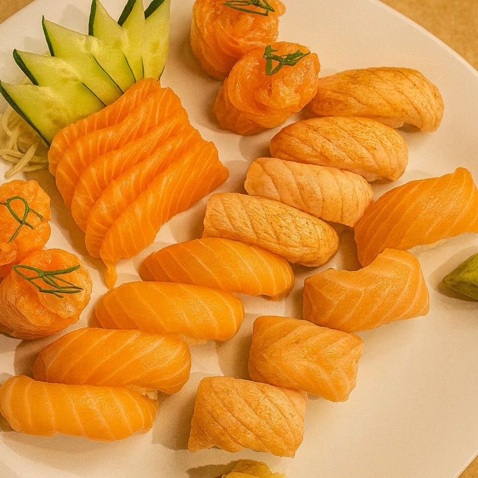 Combinado de 33 peça 4 sashimi de salmão 5 sashimi de salmão maçaricado 8 uramaki de salmão 4 Hossomaki de salmão 4 Hossomaki de pepino 4 niguiri salmão 4 niguiri de skin