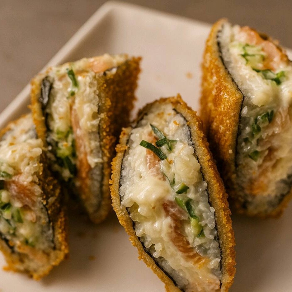 8 unidades de uramakis arroz salmão empanado e cream cheese