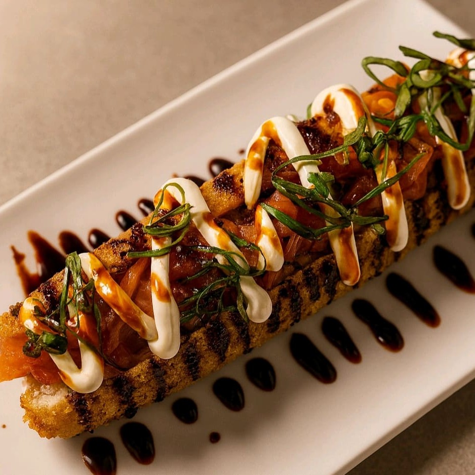 Um delicioso shushi dog com salmão asado e cheam cheese