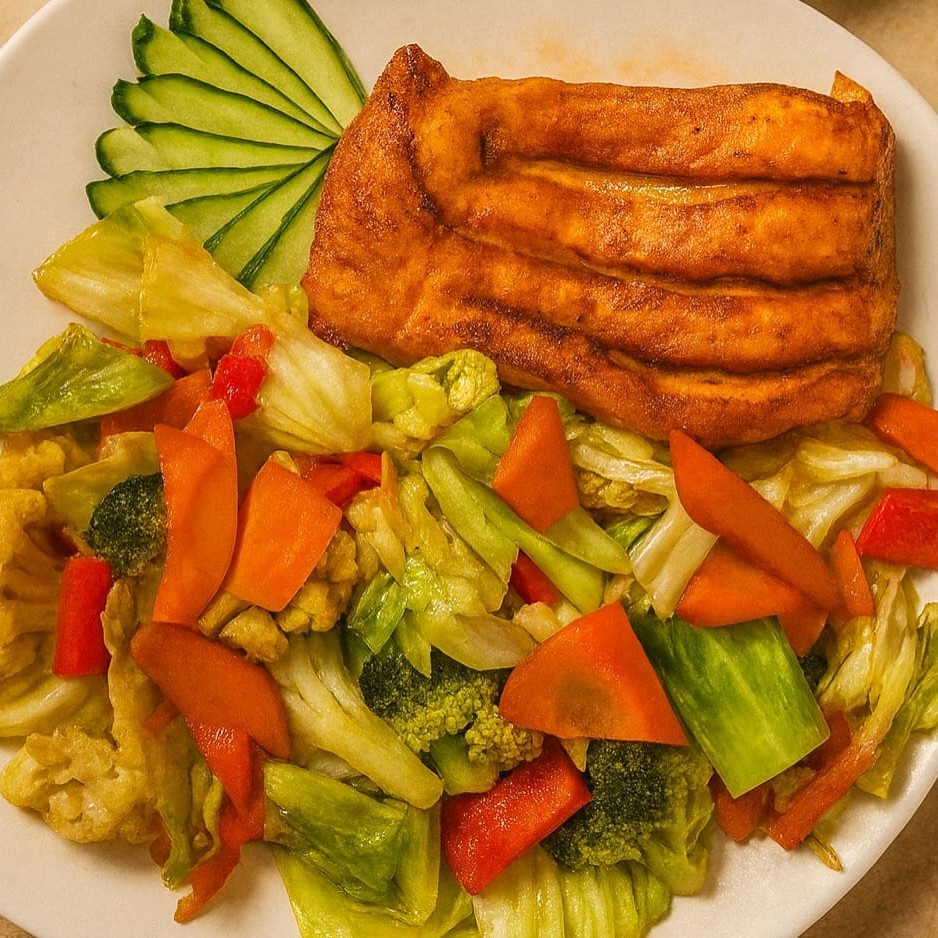 Brócolis, Repolho, acelga, Cenoura, carne frango e camarão acompanhada com um delicioso molho do chefe e uma Coca cola de brinde