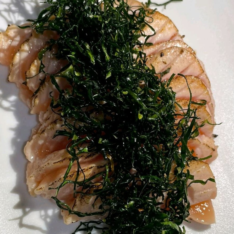 Sashimis 10 sashimis maçaricados com couve frita, uma combinação perfeita!