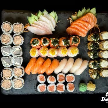 6 sashimis de salmão 2 saturo shimeji 2 riki ebi 2 salmão fresh 2 uramakis hiroki 2 uramakis hayato 2 joy de salmão c/ camarão e cheese 2 joy de salmão c/ lula e cheese 1 mini shoubai hara especial