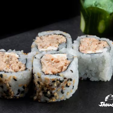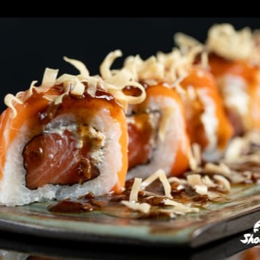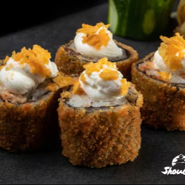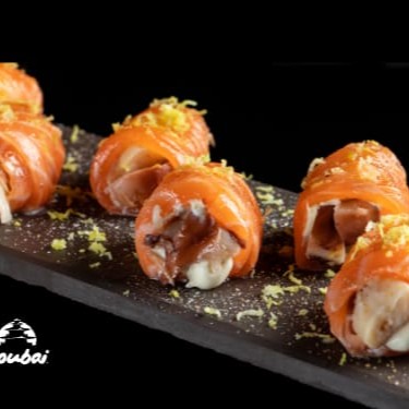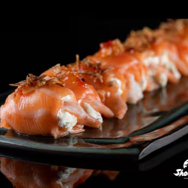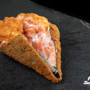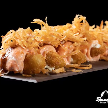 10 peças de salmão empanado, cream cheese e camarão cozido, envoltos por shari e salmão, finalizados com molho tonkatsu e crispy de harumaki crocante.