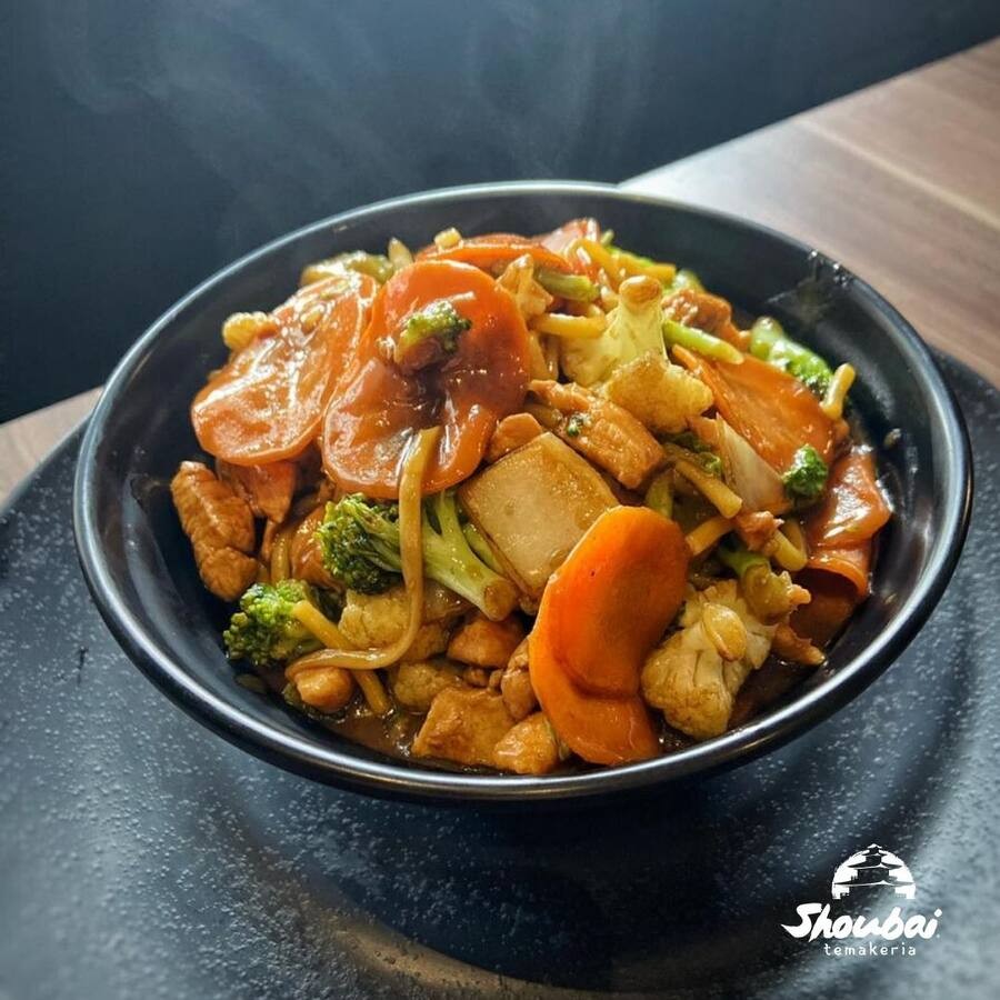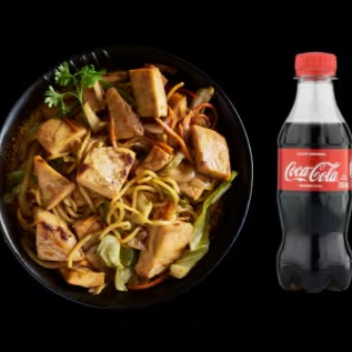 Delicioso yakissoba com macarrão oriental, frango grelhado, legumes frescos salteados e molho especial. Acompanha uma Coca-Cola 200ml gelada.